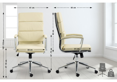 Le fauteuil de direction Torro est un fauteuil de bureau haut de gamme avec un revêtement en similicuir. Ce revêtement présente l'avantage d'être élastique et de reprendre sa forme initiale après relâchement de la pression. Outre son aspect esthétique, il prolonge la durée de vie du revêtement. Le similicuir est également respirant, ce qui est particulièrement appréciable par fortes chaleurs. La structure en métal chromé est très robuste. La hauteur du siège est réglable en continu. Le fauteuil est équipé d'un mécanisme d'inclinaison intégré pour une plus grande liberté de mouvement. Il possède cinq roulettes robustes et silencieuses. Que ce soit sur sol dur ou moquette, vous pourrez toujours vous déplacer facilement et en douceur.