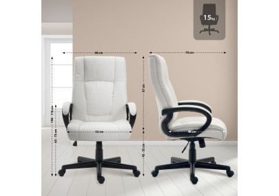 Le fauteuil de bureau XL Vaud est idéal pour les personnes de grande taille et de forte corpulence, grâce à son vérin à gaz conçu pour une utilisation continue jusqu'à 140 kg. Ce fauteuil est doté d'un revêtement de haute qualité en similicuir. Ce revêtement présente l'avantage d'être élastique et de reprendre sa forme initiale après relâchement de la pression. Outre son aspect esthétique, il prolonge également la durée de vie du revêtement. La hauteur d'assise est réglable en continu grâce au levier situé sous le siège, garantissant ainsi une assise ergonomique. Le mécanisme d'inclinaison intégré offre une plus grande liberté de mouvement. La structure du fauteuil est en métal chromé. Il repose en toute sécurité sur cinq roulettes robustes en plastique. Que ce soit sur sols durs ou moquettes, vous pourrez toujours vous déplacer facilement et en douceur.