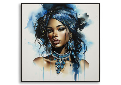 Tableau sur toile avec cadre en bois, présentant un motif abstrait et des applications.