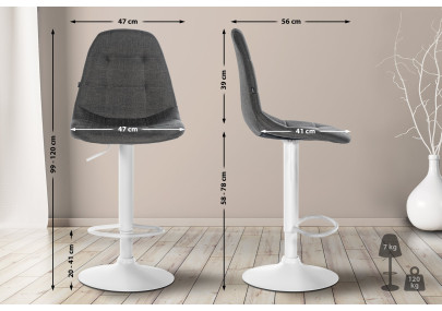 Este taburete de bar aporta un toque exclusivo a cualquier espacio e impresiona no solo por su excelente comodidad, sino también por su diseño moderno. El asiento está tapizado en piel sintética de fácil mantenimiento. Gracias a su elevador de gas, este modelo se puede ajustar a la altura deseada, lo que lo hace ideal para cualquier barra. El reposapiés, que garantiza una excelente comodidad, se ajusta en sincronía con la altura del asiento. Tanto el asiento como el reposapiés giran 360°. La estructura está disponible en cromo, blanco o negro. La base acampanada cuenta con protectores para evitar rayar las superficies.