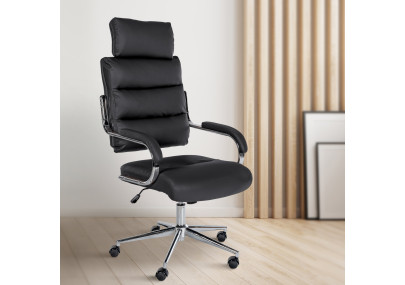 Questa sedia da ufficio offre uno stile unico grazie al vincente mix di materiali di seduta e telaio. La poltroncina da scrivania presenta infatti seduta comodamente imbottita e rivestita in similpelle di ottima qualità. La scocca poggia in modo stabile e sicuro su un telaio realizzato in metallo cromato con base a croce completa di 5 ruote a basso attrito. La seduta della poltroncina da pc è comodamente regolabile in altezza, le sue forme sono ergonomiche e adatte anche per accomodarsi per un periodo prolungato di tempo.