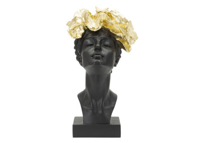 Elegante scultura nera con finiture dorata a forma di regina degli scacchi.