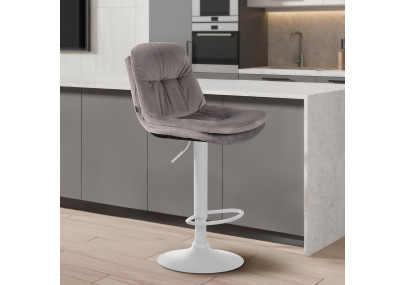 Estas banquetas impressionam pelo seu design elegante. O assento é estofado em tecido de veludo e finalizado com costuras decorativas elaboradas. Graças ao sistema de elevação a gás, este modelo pode ser ajustado à altura desejada, tornando-o ideal para qualquer altura de balcão. O apoio para os pés, que garante excelente conforto ao sentar, é ajustável em sincronia com a altura do assento. O assento e o apoio para os pés giram 360°. A estrutura é feita de metal e protetores de piso estão localizados sob a base em formato de trombeta para evitar arranhões no piso.